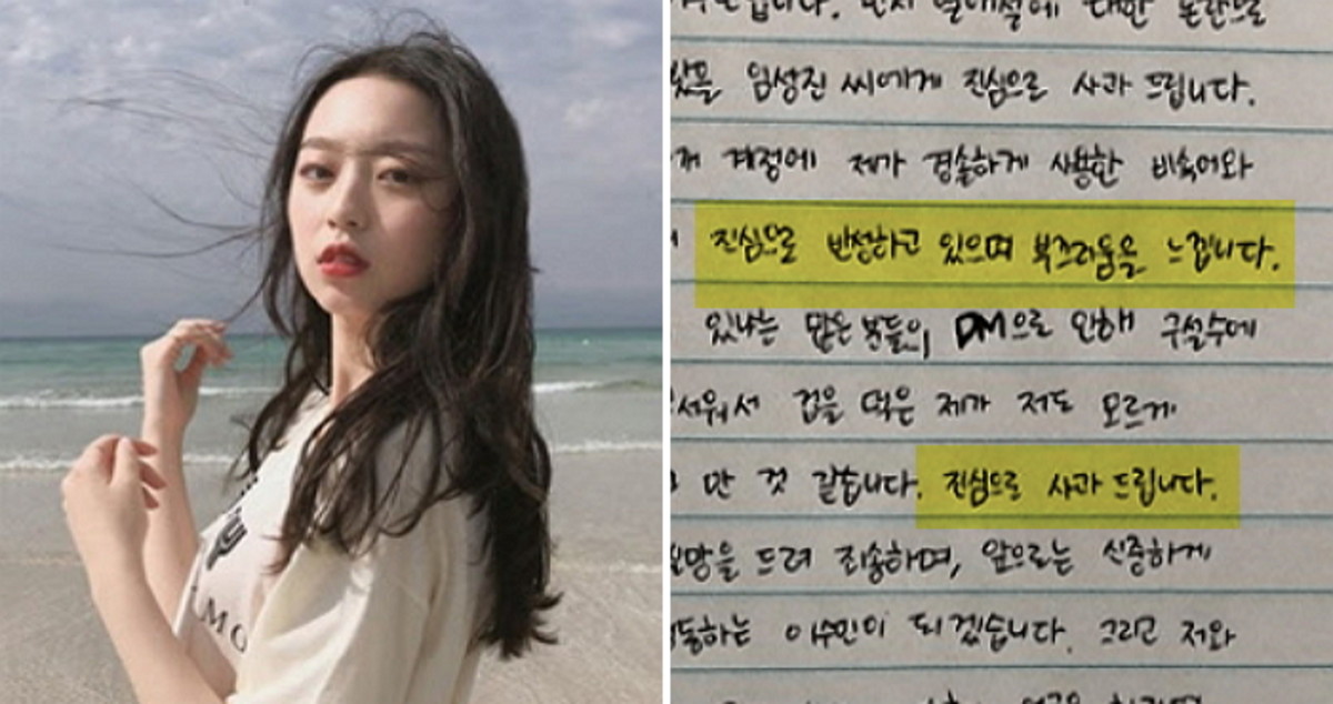 먼저 이수민은 편지에서 배구선수 임성진에게 사과했다. 그는 "열애설 논란으로 피해 봤을 임성진에게 진심으로 사과드린다"라고 밝혔다.