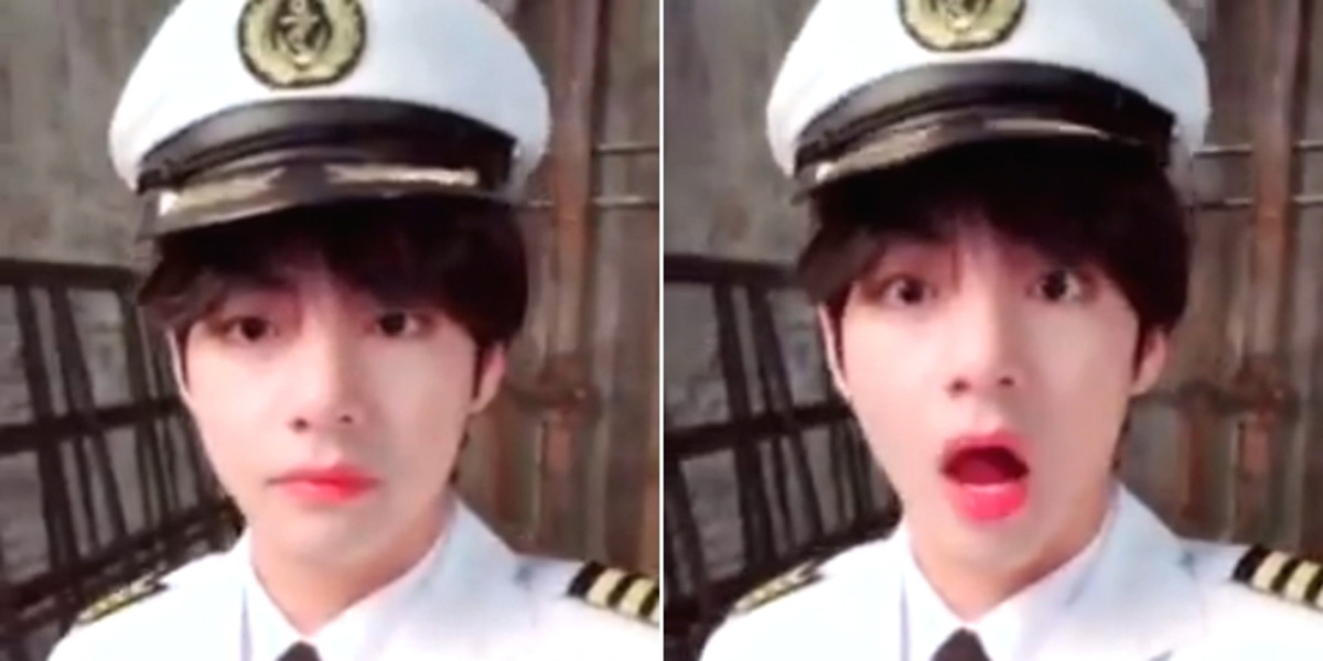 공개된 영상 속에서 뷔는 검정 넥타이에 각이 잡힌 하얀 제복, 모자를 착용한 채 카메라를 응시하고 있다.