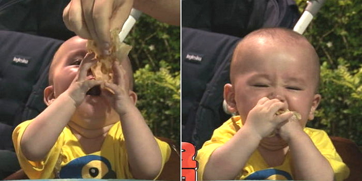 아빠 샘 해밍턴이 피자를 건네주자 벤틀리는 손보다 입이 먼저 마중 나왔다.