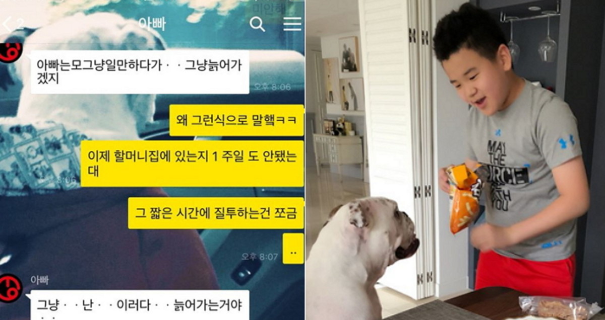 "아빠는 뭐 그냥 일만하다가...그냥 늙어 가겠지"라고 말하는 아빠의 톡을 본 윤후는 "왜 그런식으로 말해ㅋㅋㅋ. 이제 할머니 집에 있는지 1주일도 안 됐는데 그 짧은 시간에 질투하는 건 쪼금"이라고 답했다.