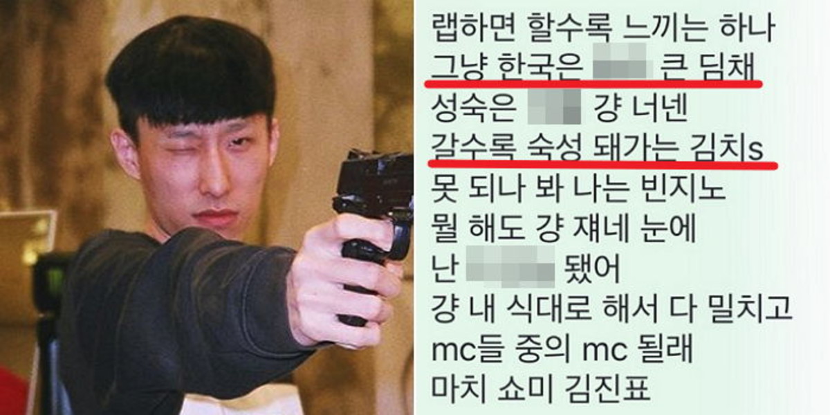 또 그는 '랩 하면 할수록 느끼는 하나, 그냥 한국은 X라 큰 딤채, 성숙은 X뿔 걍 너넨, 갈수록 숙성돼가는 김치s'라는 가사를 쓰기도 했다.