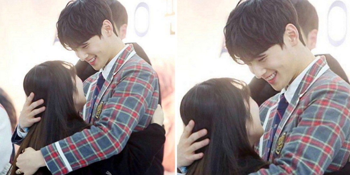 차은우는 소녀팬의 머리를 감싸 안으며 자신의 품 안으로 끌어안았다. 그러면서 그는 꿀 떨어지는 눈빛으로 팬을 바라보며 해맑게 웃고 있다.
