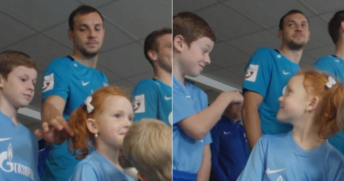 모두가 경기를 앞두고 긴장한 상황에서 제니트의 공격수 주바는 자신의 앞에 있던 여자아이의 머리를 살짝 잡아당기며 장난을 친다.