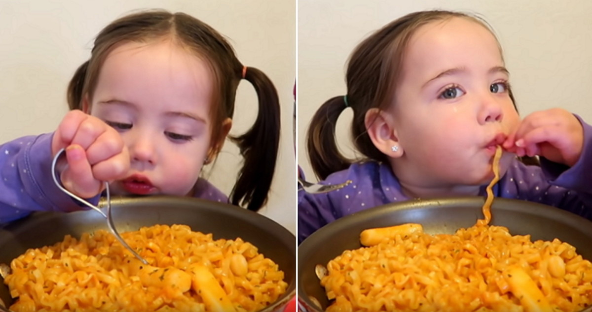 공개된 영상 속에는 머리를 양 갈래로 묶은 귀여운 꼬마가 까르보나라 불닭볶음면이 담겨있는 프라이팬 앞에 앉아있다.