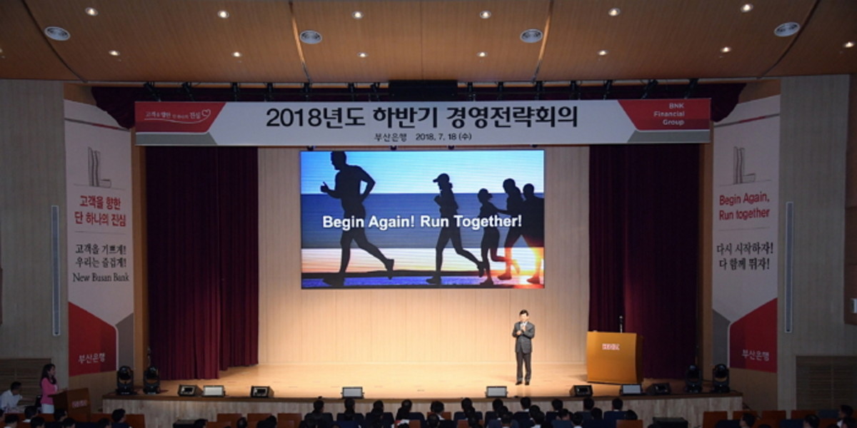 한편 부산은행은 모든 것을 새로운 마음으로 다시 시작하겠다는 의지에서 경영전략회의 슬로건을 '비긴 어게인, 런 투게더(Begin Again! Run Together)'로 정했다.