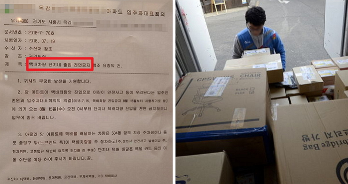 입주자대표는 "택배 기사들에게 수차례 부탁을 했지만 서행하지 않고 무분별하게 배송하는 차량에 아이가 치일 뻔하는 등 아파트에서 몇 번이나 큰 사고가 발생할 뻔 했다"며 "이와 관련해 택배 기사들과 합의점을 찾아보고자 선제적으로 해당 공문을 작성한 것"이라고 설명했다.