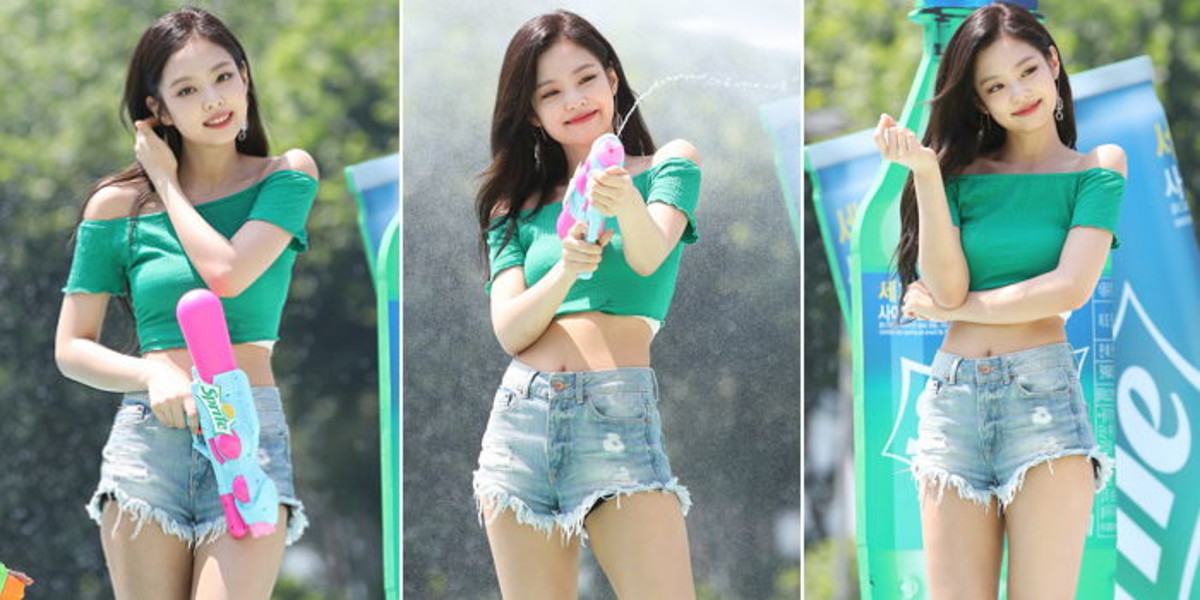 제니는 상큼한 포즈로 물총을 쏘며 잘록한 허리와 쇄골라인을 드러냈다.