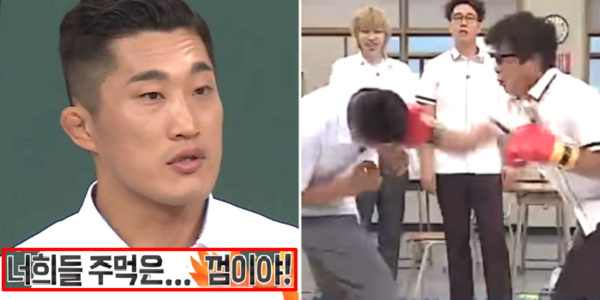김희철이 글러브를 끼고 주먹을 날리는 시늉을 하자 김동현은 어깨를 잔뜩 웅크리며 겁먹은 듯한 모습을 보였다.