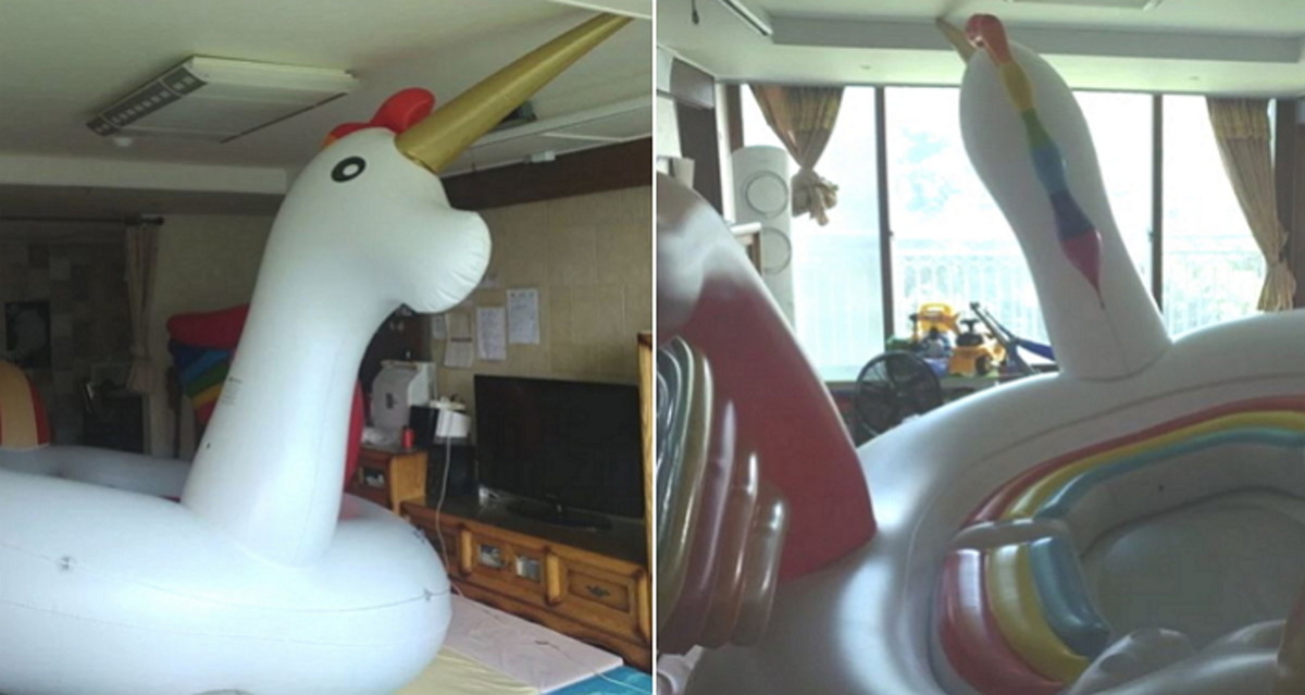 사진 속에는 황금 뿔과 무지개색 날개 그리고 앙증맞은 꼬리를 지닌 귀여운 유니콘 모양의 튜브가 보인다.