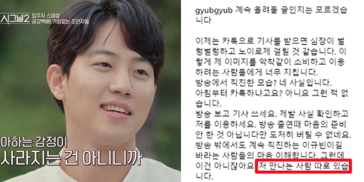 방송 보고 기사 쓰세요. 제발 사실 확인하고 저를 이용하세요. 방송 출연때 마음의 준비 안 한 것 아닙니다만 도저히 버틸 수 없네요. 방송 밖에서도 계속 직진하는 이규빈이길 바라는 사람들의 마음 이해합니다. 그런데 이건 아니잖아요. 저 만나는 사람 따로 있습니다.
