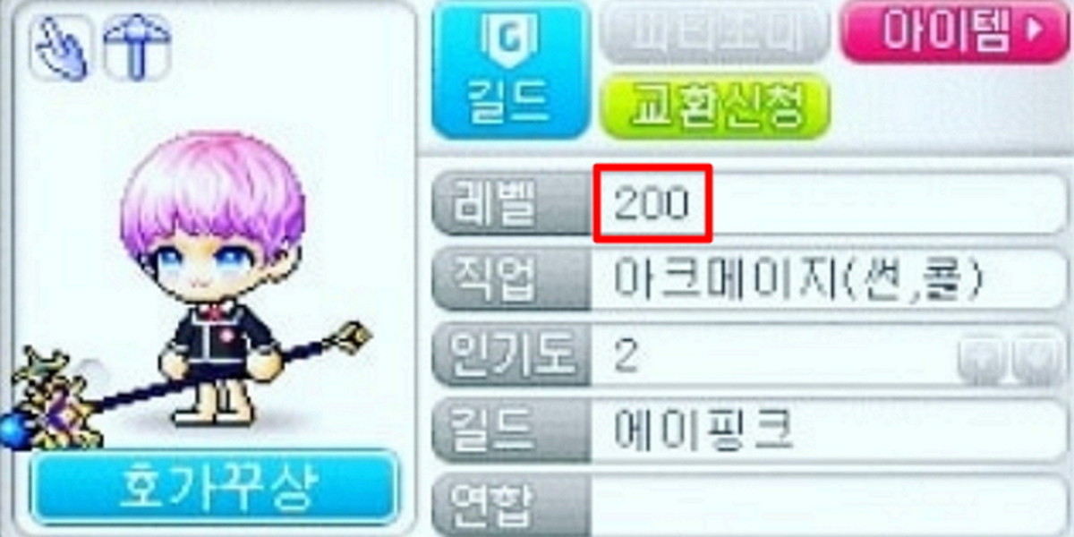 레벨 200에 달하는 해당 캐릭터는 허각이 직접 키운 것으로 번개와 얼음을 다루는 아크메이지 직업을 갖고 있다.