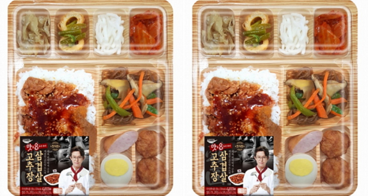 '맛8한국편 고추장 삼겹살' 도시락은 백미밥 위에 매콤한 고추장 소스를 발라 바삭하게 구운 삼겹살을 수북이 얹어 먹음직스럽게 담은 상품이다.