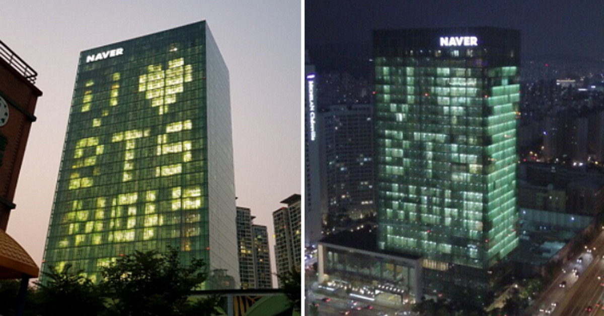 공개된 사진 속 네이버 사옥에는 "V ♥ BTS 천만!"이라는 글씨로 방탄 소년단을 축하하는 조명이 밝혀졌다.