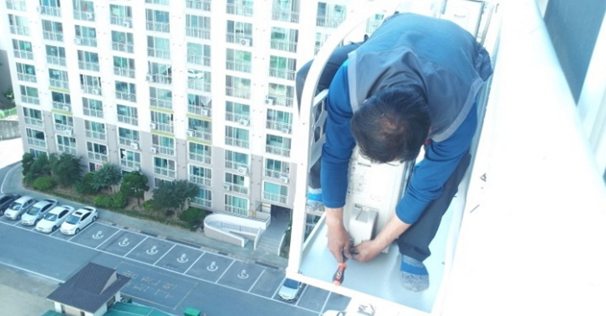 게재된 사진에는 보기만 해도 아찔한 높이의 고층 아파트에서 설치 기사가 곡예 수준으로 실외기 설치에 열중하고 있다.