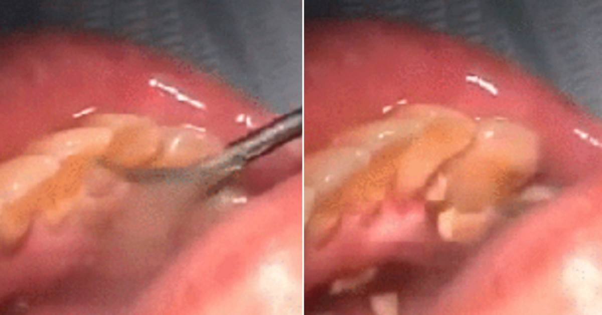 공개된 영상 속에는 의사가 뾰족한 날이 달린 도구로 환자의 치아에 달라붙은 치석을 제거하고 있다.