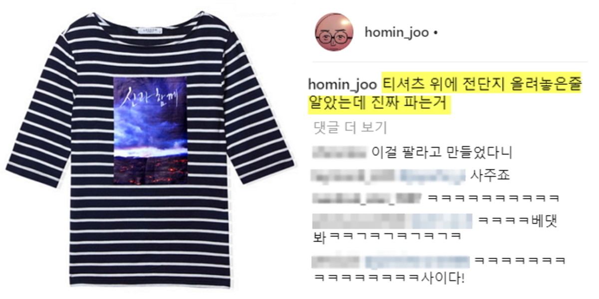 실제로 '신과 함께' 웹툰 원작자 주호민은 자신의 인스타그램을 통해 해당 티셔츠에 대한 생각을 전하기도 했다.