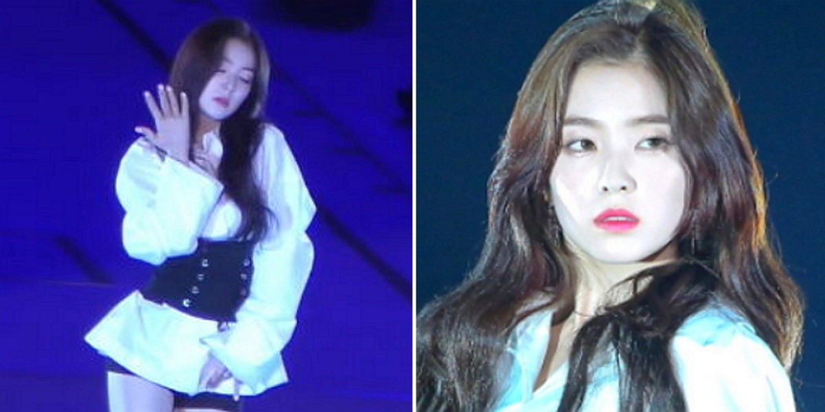 이날 아이린은 숏팬츠에 루즈핏 흰색 셔츠, 검정 코르셋 벨트를 매치한 채 등장했다.