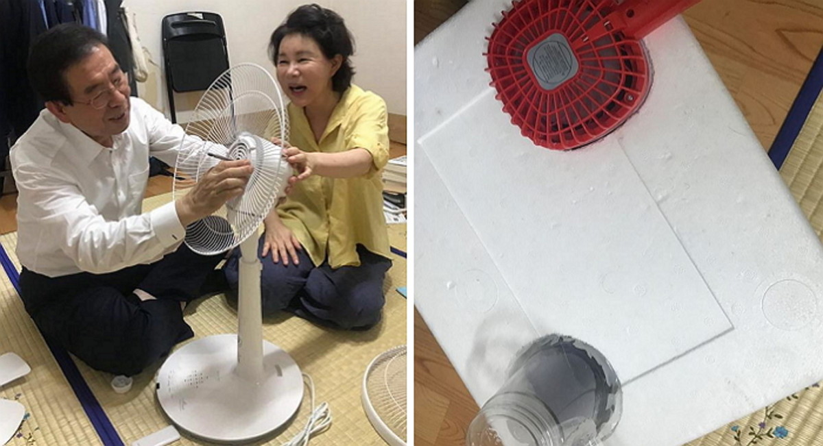 2일 박 시장은 자신의 인스타그램에 옥탑방에서 선풍기와 얼음으로 만든 수제 에어컨 바람을 쐬고 있는 사진을 올렸다.