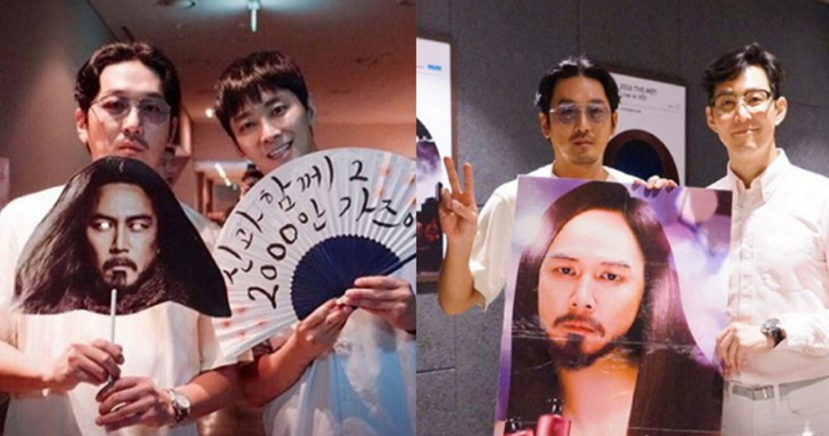 하정우는 극중 '염라대왕'으로 분한 이정재의 가면부채를, 주지훈은 '신과함께2 2000만 가즈아'라고 적힌 전통부채를 들고 있다.