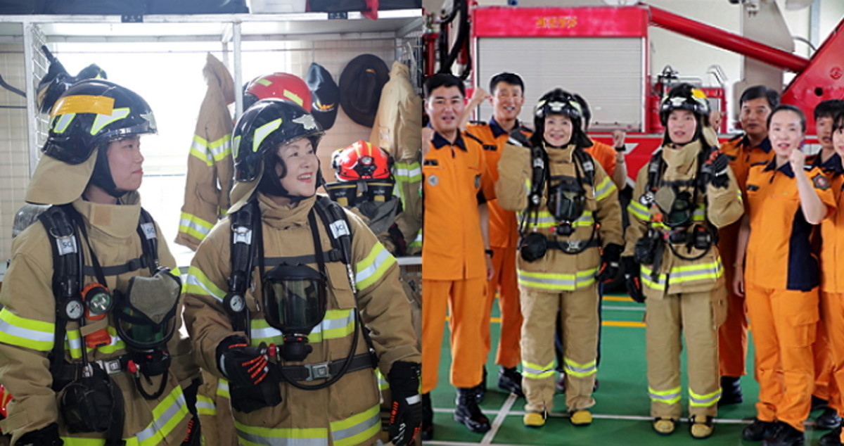특히 이날 김 여사는 30kg을 넘어서는 무거운 특수방화복을 입어보는 등 일선 소방관들의 어려움에 공감하는 시간을 가졌다.