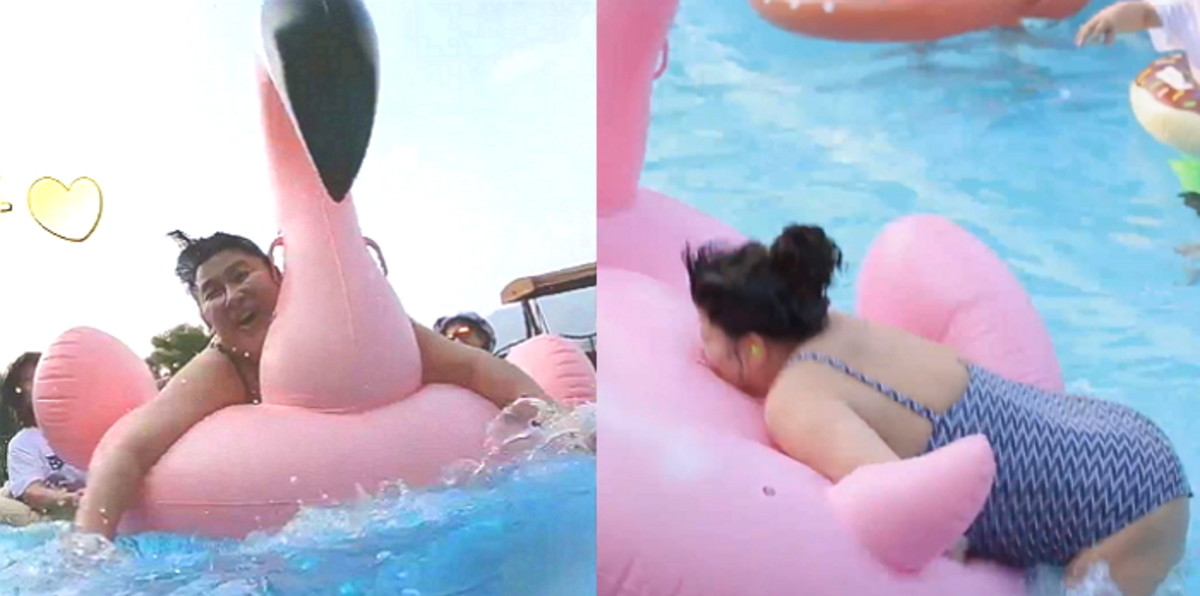 이영자는 다른 이에게 홍학 튜브를 뺏길까 재빨리 먼저 홍학 튜브에 올라탔다.