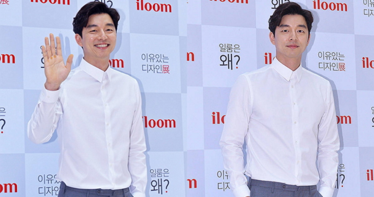 공유는 흰색 셔츠에 회색 슬랙스, 그리고 하얀색 로퍼를 매치해 단정한 스타일링을 선보였다.