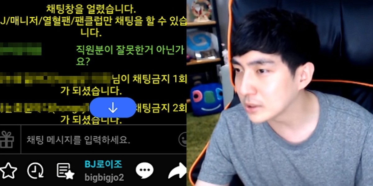 방송을 시작한 로이조는 '채팅창 얼리기' 기능을 활성화했다. '채팅창 얼리기' 기능을 이용하면 BJ와 매니저, BJ에게 별풍선을 쏜 적 있는 시청자 등만 채팅할 수 있다.