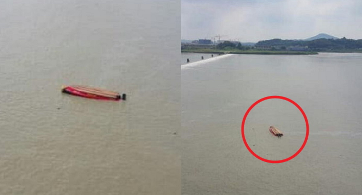현장에 있던 민간 보트는 한쪽 바람이 빠진 채 강 위에 떠 있었다.