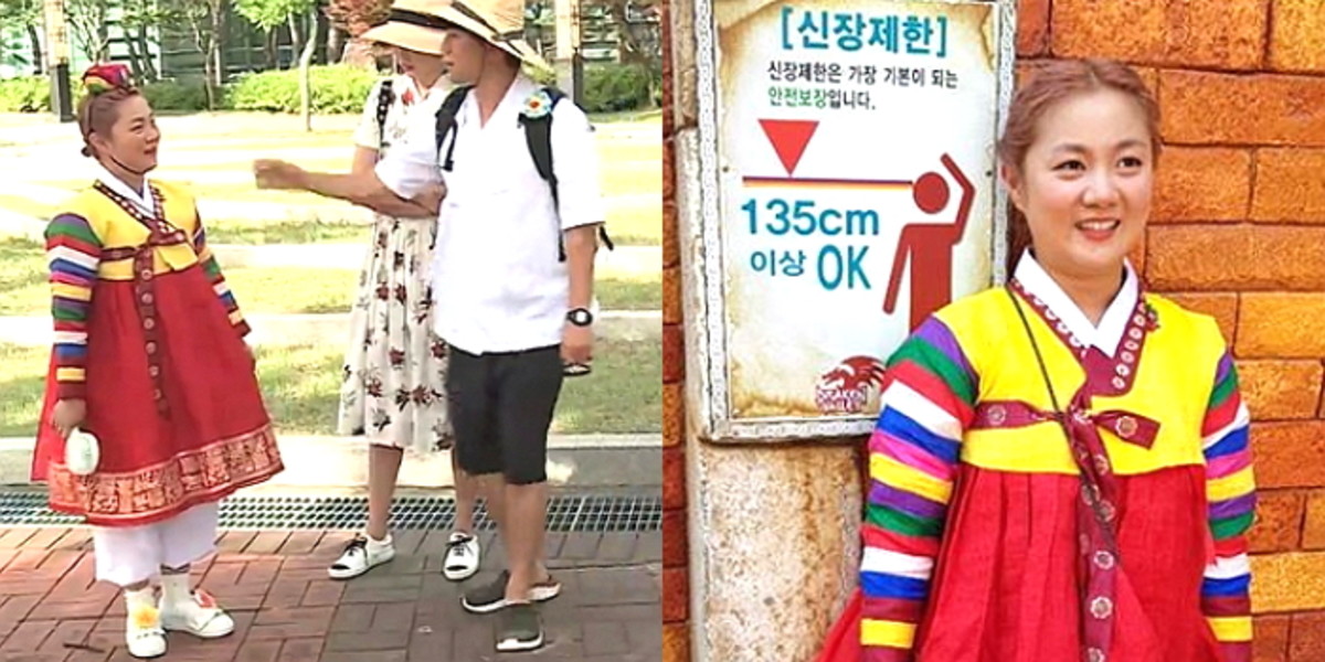 박나래는 색동 한복 차림으로 놀이기구 신장제한 안내판 앞에 서 있는 모습이다.