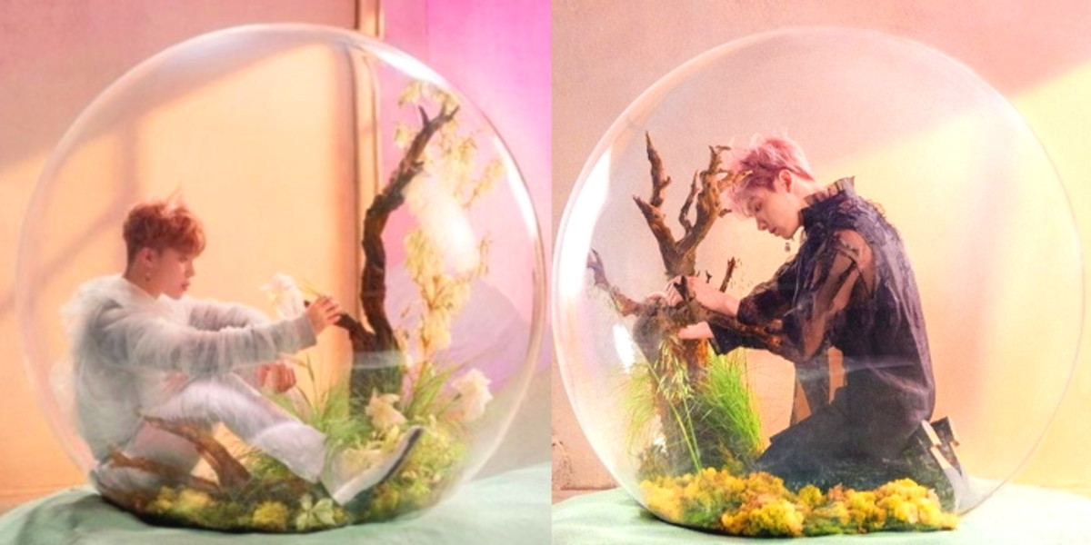 유리구슬 속 멤버들은 각자 다른 꽃과 나무에 둘러싸인 채 서정적인 표정으로 몽환적인 분위기와 신비감을 조성한다.