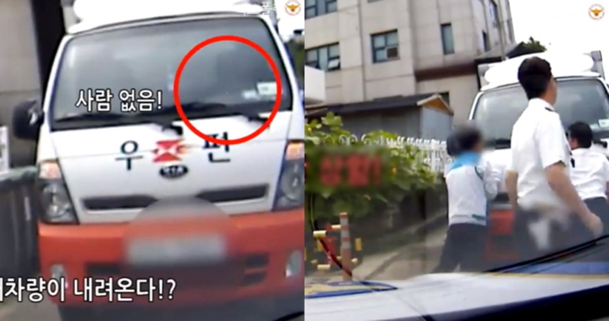 그사이 한 경찰관은 주변 사람들을 안전하게 대피시키고 다른 경찰관은 택배 차량 안으로 들어가 브레이크를 채웠다.