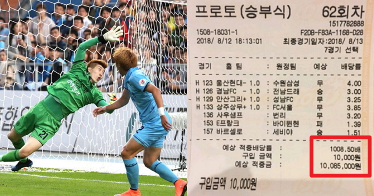 1008.5배도 놀랍지만 그 무엇보다 놀라운 점은 'K리그' 경기를 무려 4개나 맞췄다는 것. 게다가 모든 경기가 '핸디'(핸디캡을 안고 돈을 거는 것)였고, 그 맞추기 힘들다는 '무승부'가 세 개였다.