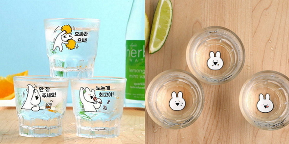 해당 아이템은 투명한 소주잔에 인기 캐릭터 '오버액션토끼(오액토)'가 그려진 게 특징이다.