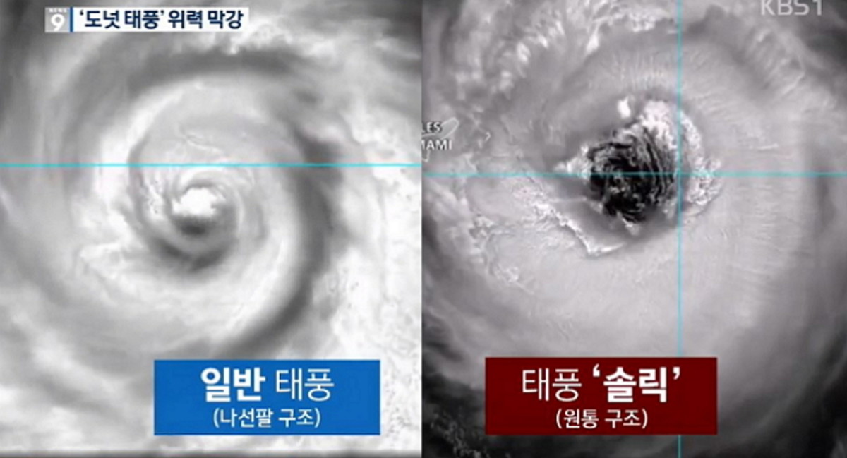태풍 솔릭은 큰 눈을 둘러싼 둥근 구름 모습 때문에 '도넛 태풍'이라 불린다.