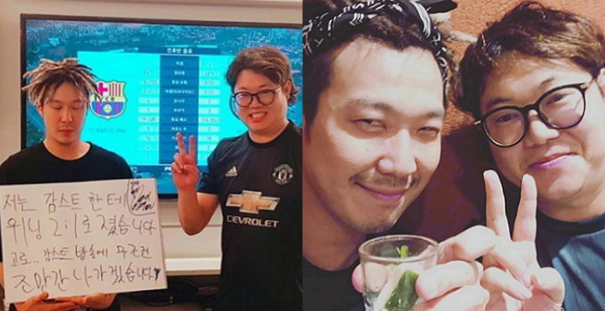 이와 함께 사진 속 하하는 눈을 질끈 감고 있는데, "저는 감스트한테 위닝 2:1로 졌습니다. 고로 감스트 방송에 무조건 조만간 나가겠습니다!"라고 적힌 스케치북을 들고 있다.