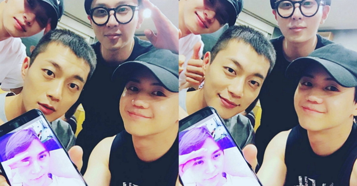 공개된 사진 속엔 양요섭, 용준형, 이기광과 다정하게 셀카를 남기고 있는 윤두준의 모습이 담겨 있다.