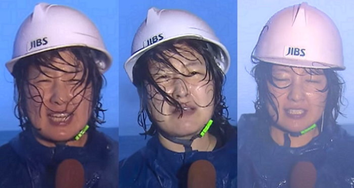 하지만 구 기자는 끝내 포기하지 않고 비바람에 눈을 뜰 수 없어 질끈 감은 채로 태풍 상황의 신속한 전달을 위해 끝까지 고군분투해 시청자들의 박수를 받았다.