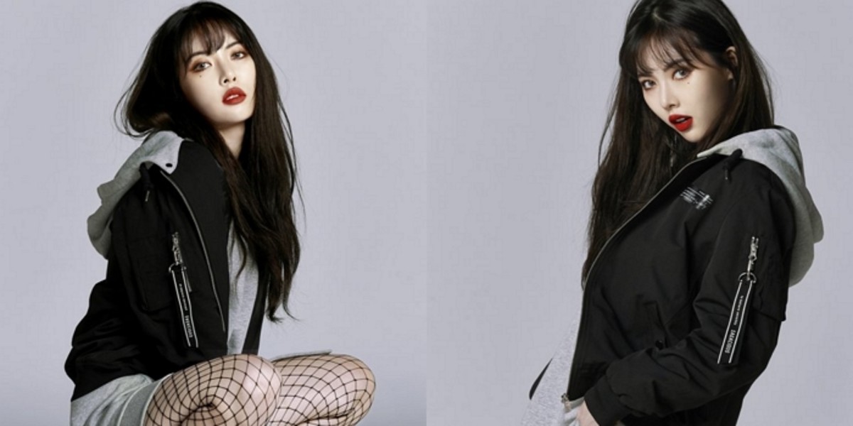현아는 블랙 재킷에 그레이 컬러 후드티, 블랙&화이트 로고 티셔츠, 망사스타킹을 착용한 채 치명적이면서도 섹시한 다양한 포즈로 섹시한 분위기를 연출했다.