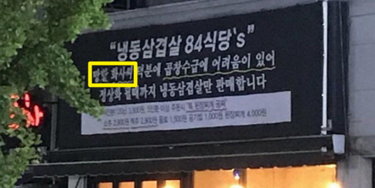 현수막에는 "망할 화사씨 덕분에 곱창수급에 어려움이 있어 정상화 될때까지 냉동삼겹살만 판매합니다"라는 문구가 적혀있다.