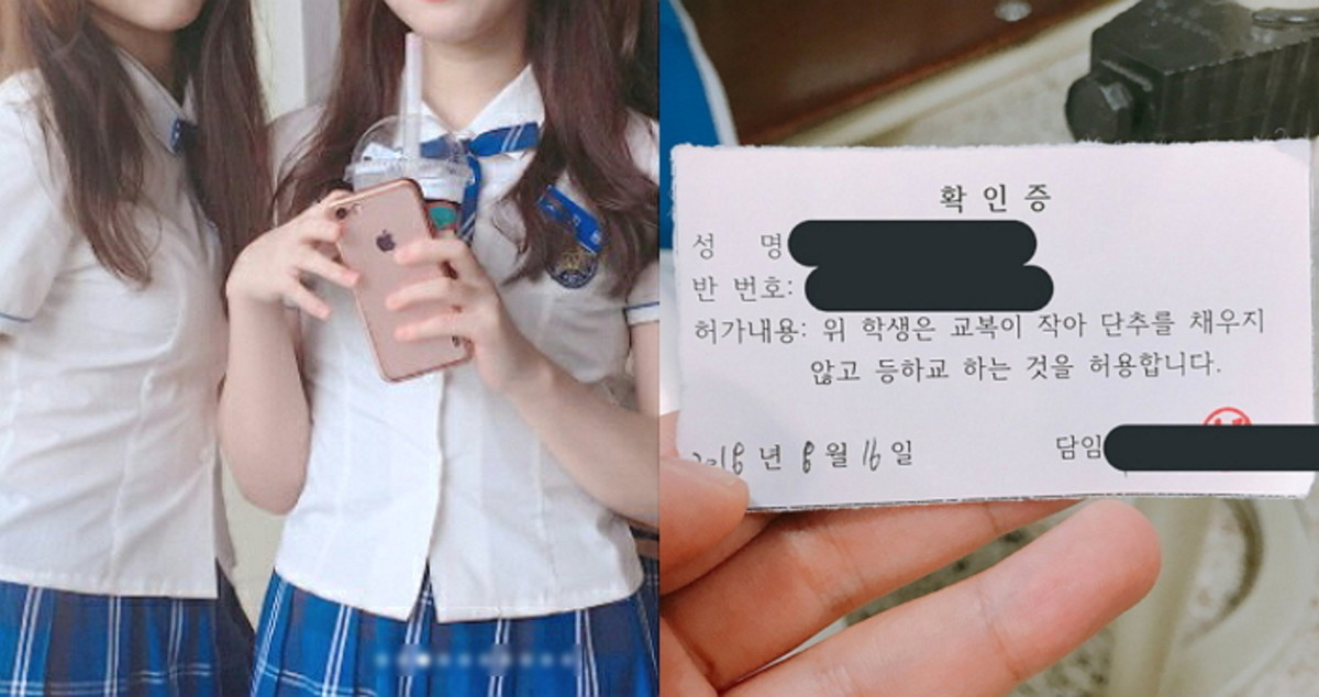 성명과 학급, 학번을 적는 란에 '위 학생은 교복이 작아 단추를 채우지 않고 등하교하는 것을 허용한다'는 내용이 적혀 있었다. 아래 담임교사의 허가 도장을 받는 란도 존재했다.