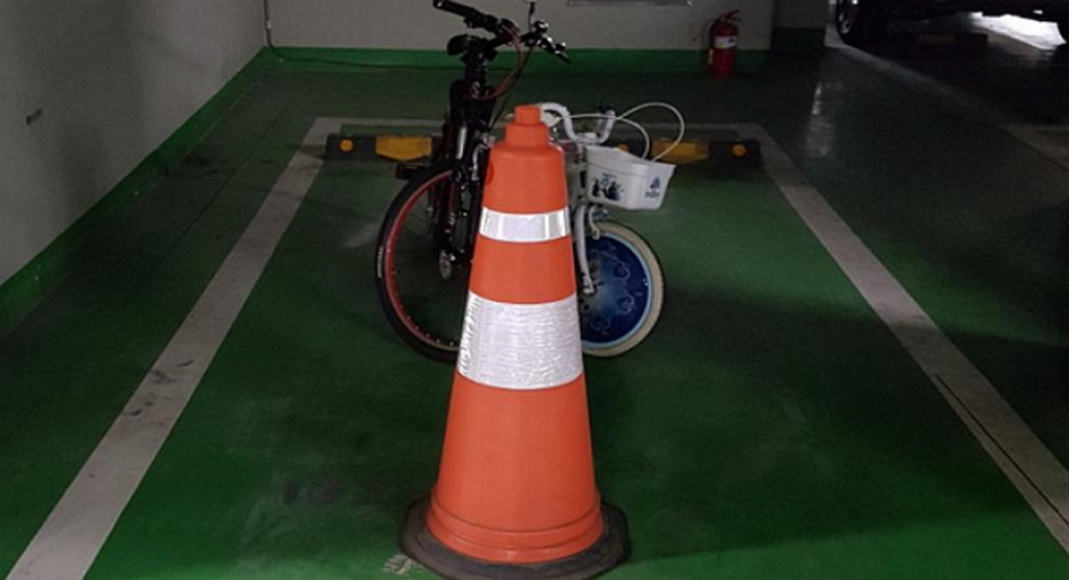 공용으로 쓰는 주차장에서 자전거와 칼라콘으로 자리를 '찜' 해 놓은 것이었다.
