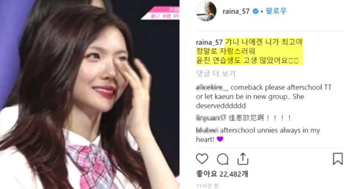 레이나는 1일 자신의 인스타그램에 "갸니(이가은의 애칭) 나에겐 니가 최고야. 정말로 자랑스러워. 윤진 연습생도 고생 많았어요"라는 글과 함께 한 장의 사진을 게재했다.