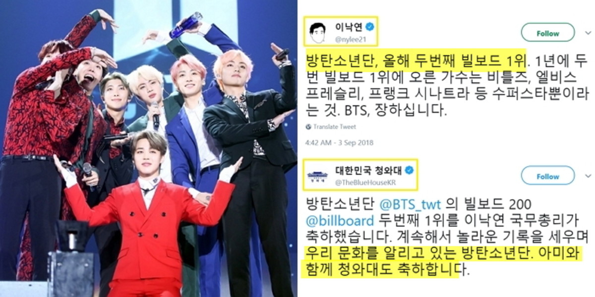 이낙연 총리는 지난 3일 자신의 트위터를 통해 "방탄소년단, 올해 두 번째 빌보드 1위"라며 "BTS, 장하십니다"라고 말했다.