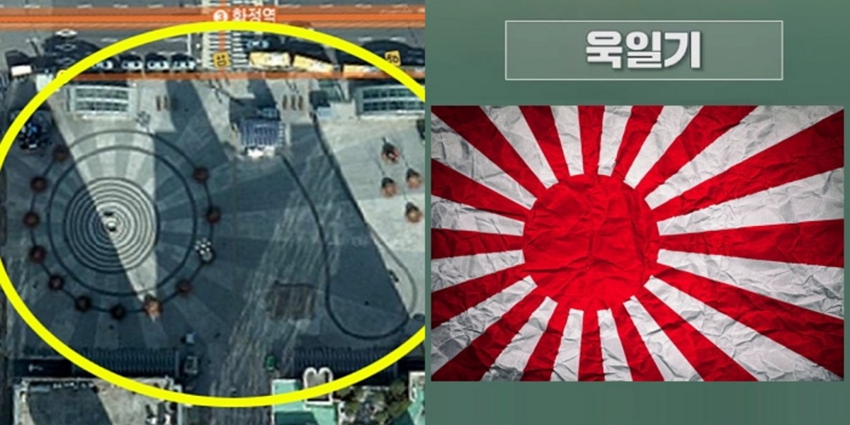 실제로 광장 분수대와 주변 보행로가 붉은 원 주위로 퍼져나가는 햇살을 표현한 욱일기의 모습과 유사해 보인다.