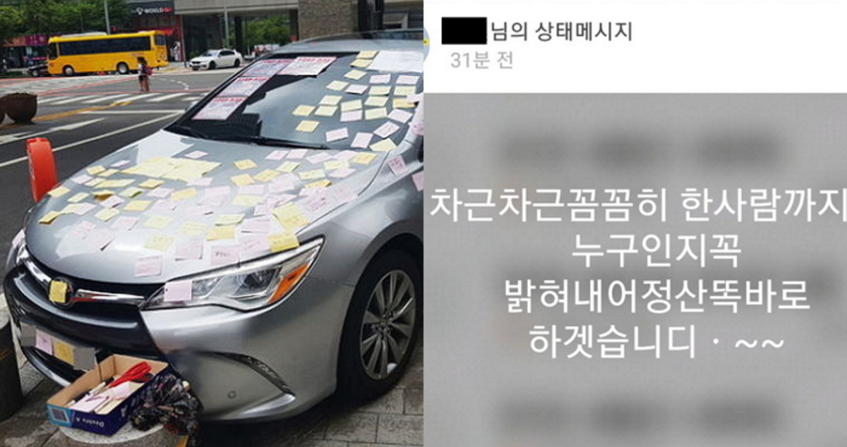 자신의 차량 앞 유리에 주차 단속 스티커를 붙였다는 게 그 이유였다.