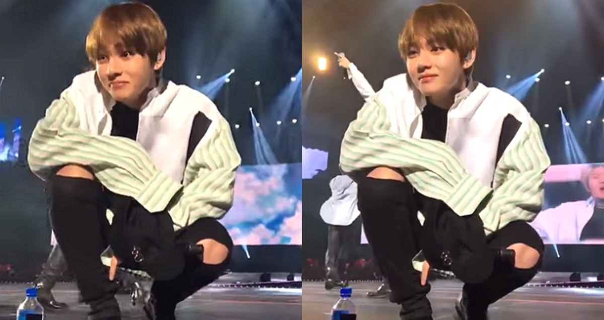 한창 무대에 심취해 있던 뷔는 팬의 목소리에 즉각 응답하며 무대 앞으로 나와 팬 앞에 주저앉았다.