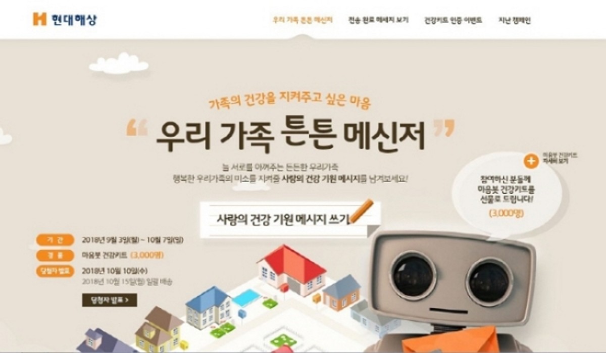 현대해상은 다음달 7일까지 캠페인을 진행하며 '하이 마음봇' 인터넷 사이트에 접속 후 가족에게 건강을 기원하는 메시지를 작성해 전달하면 추첨을 통해 3,000명에게 '마음봇 건강키트'를 증정한다.
