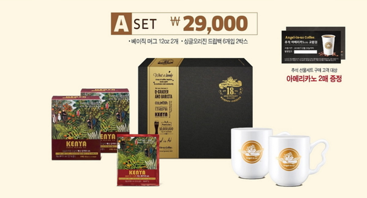 먼저 엔제리너스의 상징인 천사날개 모양 손잡이가 달려있는 베이직 머그 2개와 싱글오리진 드립백 6개입 두박스로 구성된 'A세트'가 준비돼 있다. 가격은 2만 9천원.