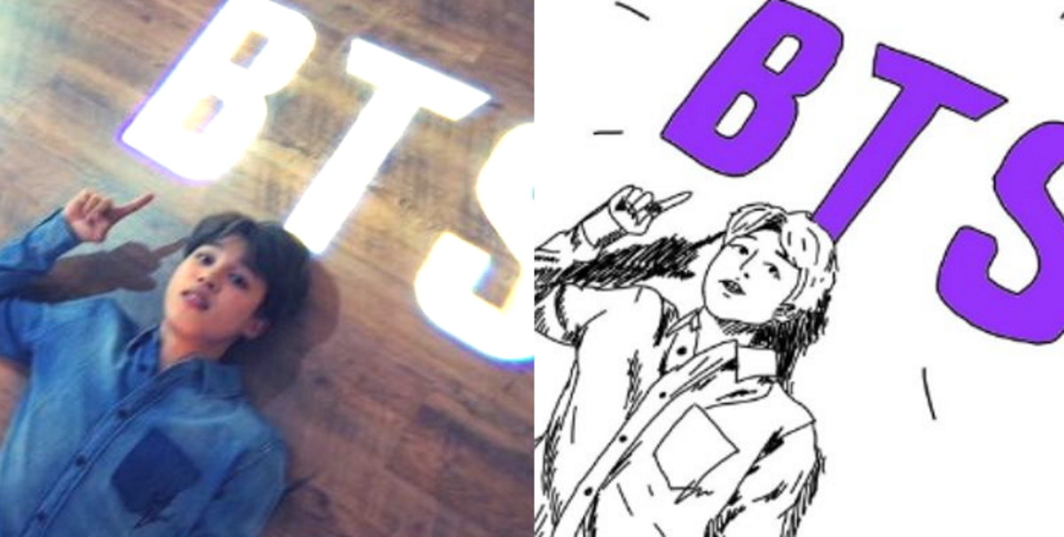 16일 지민은 방탄소년단의 공식 트위터에 "정국이가 그려준 그림, JIMIN, 꾹"이라는 글과 함께 사진 두 장을 게재했다.