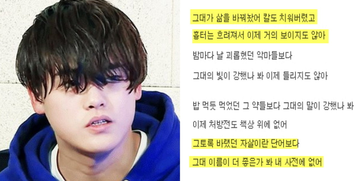 "그대가 삶을 바꿔놨어 칼도 치워버렸고 흉터는 흐려져서 이제 거의 보이지도 않아", "밥 먹듯 먹었던 그 약들보다 그대의 말이 강했나 봐, 이제 처방전도 책상 위에 없어", "그토록 바랬던 자살이란 단어보다 그대 이름이 더 좋은가 봐 내 사전에 없어"라는 가사도 눈길을 끈다.